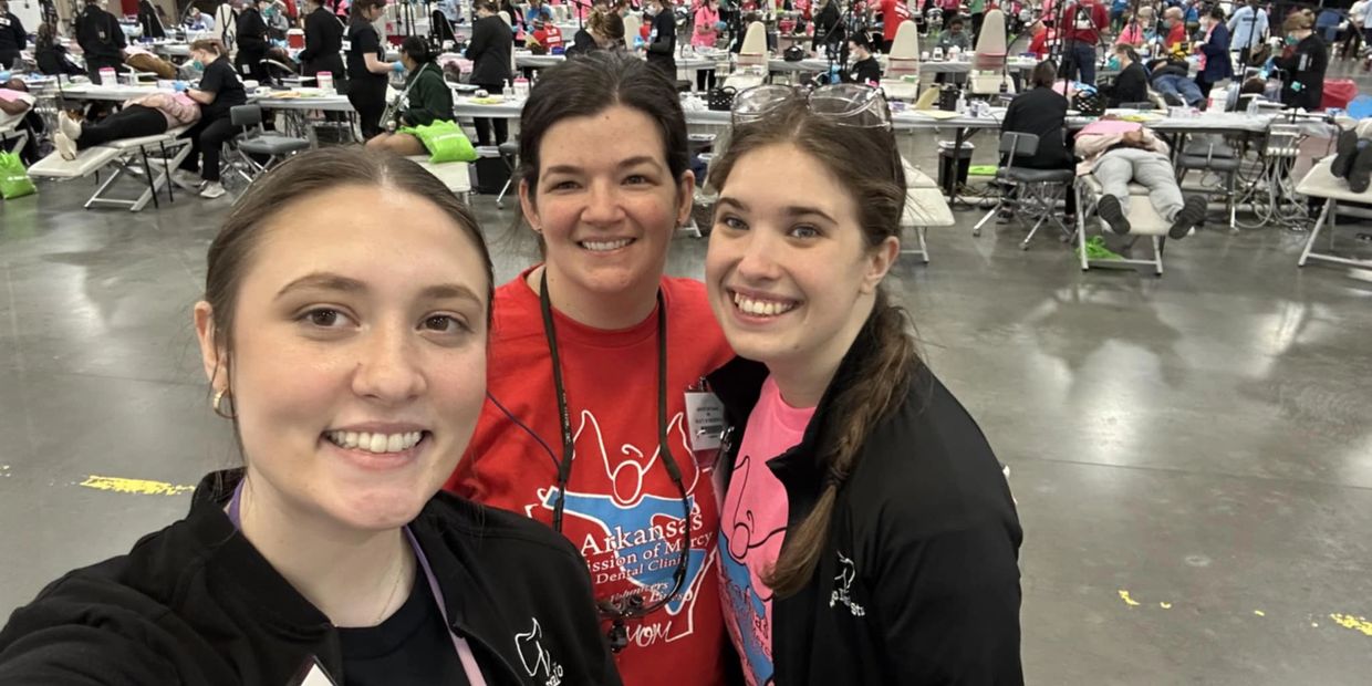 Emma, Grace and Dr. Schroepfer volunteering at Arkansas Mission of Mercy 2025 in Conway, AR providing dental treatment.